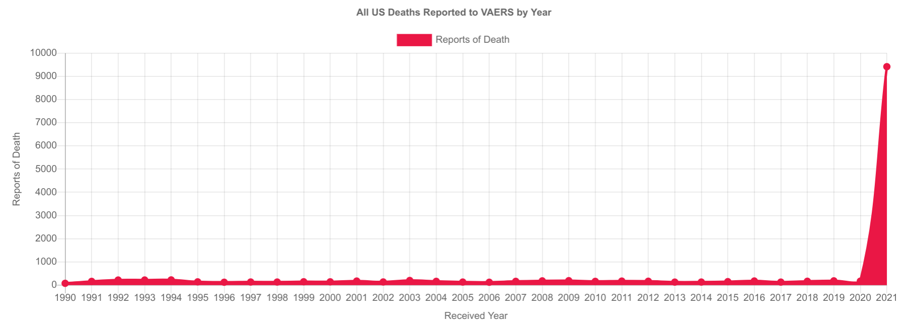 Wykres przedstawia sumaryczną liczbę zgonów spowodowanych szczepieniami na przestrzeni ostatnich 30 lat w USA. Trzeba pamiętać, że programy szczepień w USA są bardzo rozbudowane. Typowy dorosły Amerykanin ma na swoim koncie ponad 70 różnych preparatów! Przyrost zgonów w roku 2020 i 2021 jest tak duży, że nie można go wytłumaczyć powszechnością szczepień kowidowych. Punktem odniesienia są bowiem NOP-y z poprzednich lat obejmujące wszystkie szczepienia. Jeżeli przyjmiemy dla uproszczenia, że Amerykanie dożywają średnio 75 lat to statystycznie przyjmują 1 dawkę na rok jakiejś szczepionki. Oczywiście młodzi przyjmują po kilka na rok, starsi co kilka lat lub wcale. Średnio jednak wypada 1 dawka/rok, a nas interesuje ogólna liczba dawek. W roku 2020 pojawiają się szczepionki na Covid, które skokowo zwiększają liczbę szczepień. Załóżmy, znów dla uproszczenia, że dawki przyjęło 100% Amerykanów (w rzeczywistości ok. 72%). Oznacza to, że ze średniej 1 dawka/rok wskakujemy na średnią 2 dawki/rok, bo w jednym roku przyjmujemy 1 dawkę ze standardowego kalendarza szczepień i 1 dodatkową dawkę na Covid. Gdyby uwzględnić 2 dawki szczepionek na Covid, to przeskoczymy do poziomu 3 dawki/rok. Powyższy wykres pokazuje jednak przywzrost wyraźnie większy niż ×2 czy nawet ×3. Widać po prostu, że te preparaty są… inne.